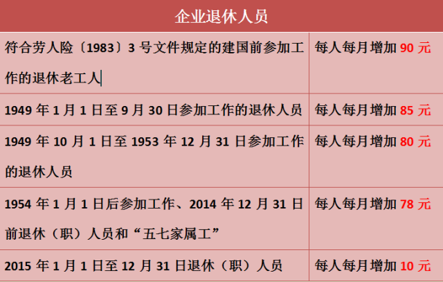 2.退休(职)人员、“五七家属工”按照本人2015年12月领取的统筹内月基本养老金为基数,按0.5%的比例增加基本养老金。